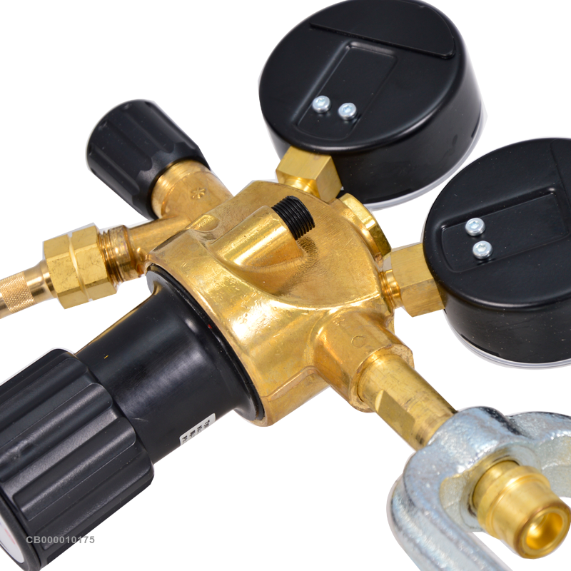 Входное соединение представляет собой надежный хомут с помощью которого редуктор крепится. На оборудование установлены два профессиональных манометра от фирмы WIKA, которые являются наиболее передовыми на рынке прибор измерения давления. На выходе установлен запирающий вентиль, сама конструкция оснащена сбрасывающим клапаном. Поэтому достигается высокая степень безопасности при работе.